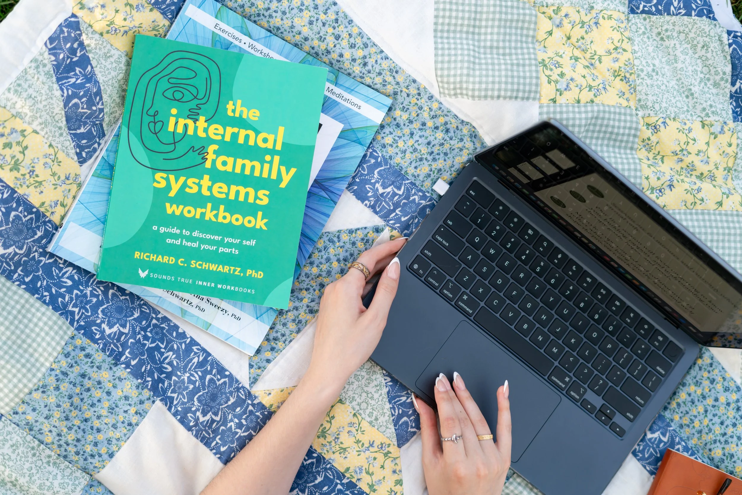 A person using a laptop on a quilted blanket, with a book titled 'The Internal Family Systems Workbook' by Richard C. Schwartz, PhD, and some papers related to exercises, meditation, and healing.